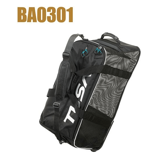 The TUSA BA0301 Mesh Roller Bag provides ample room for a full set of dive gear. Durable rubberized mesh and an oversized main compartment opening make this the perfect duffle bag for watersports. Durable smooth gliding wheels are a great addition to the bag as well as an internal pocket shoulder strap and two heavy duty carry handles. FEATURES Large outer pocket 1 internal pocket Adjustable shoulder strap 1 top and 2 side carry handles. Dimension LxWxH 29.9x13.8x11.8inch 76x35x30cm Weight Dry 5.5lb 2,510g Capacity 92L